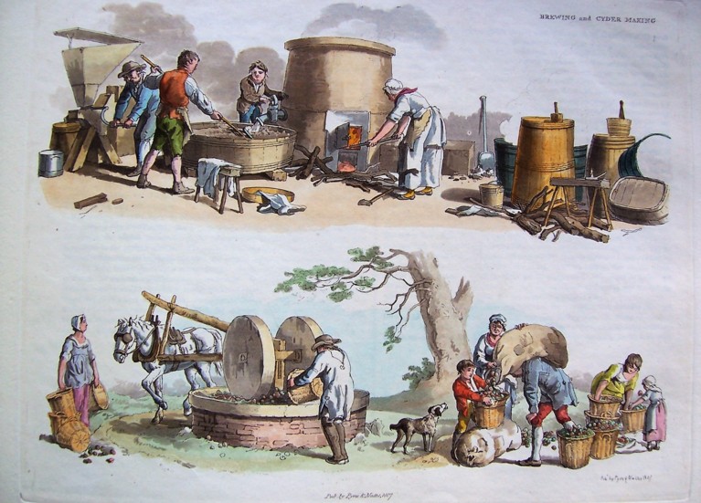 At a period when beer (and, in western counties, cider) were staples for working people, Pyne shows figures busily engaged in brewing and cider making, with scenes of grinding malt and brewing, and a horse mill for bruising the cider apples that are being collected.