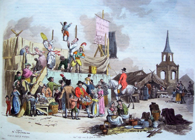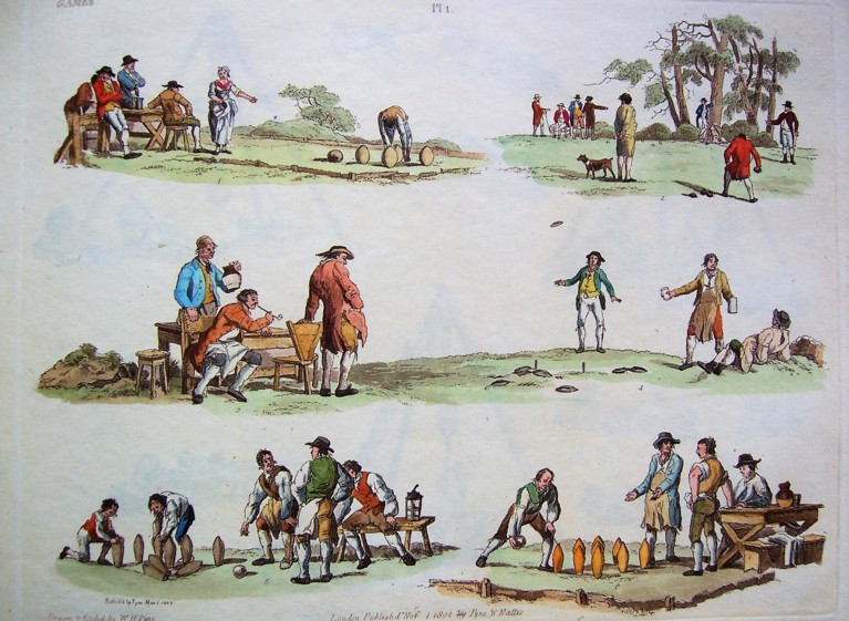 Pyne also includes plates showing enjoyment of traditional rural sports and pastimes: here, several forms of skittles, a game of quoits, and (top right) a game of bowls – the latter a pastime that (Pyne deplores) is fast falling out of fashion at the time and being replaced by cricket.