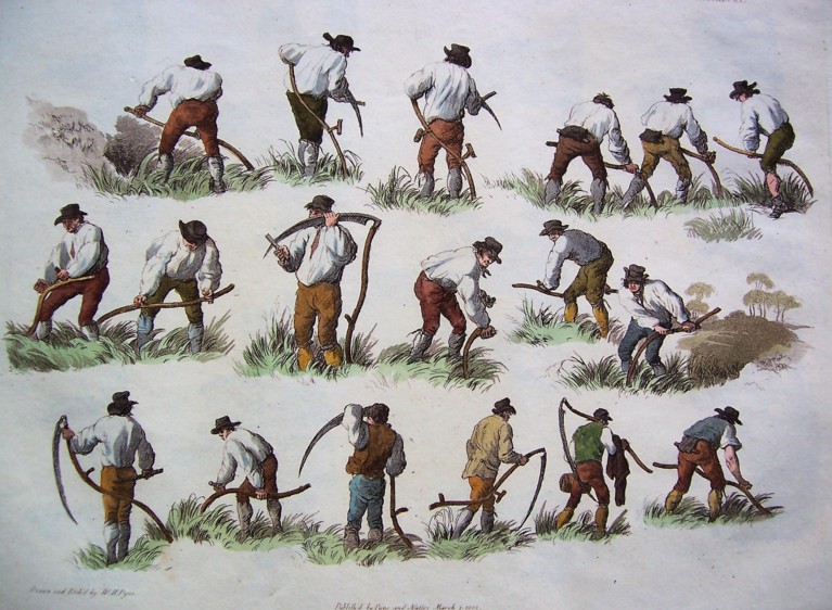 Three rows of six mowers are shown in various attitudes, at work or sharpening their scythes. Traditionally they work in groups of three, and each makes a sweep at the same time. The second cuts what is left by the first, and the third what is left by the second, ‘and they come so near each other … that the beholder is apt to be in a state of continual alarm for their safety – but from the mechanical exactness of the semi-circle which they form, acquired by practice, seldom any accident occurs …’ A figure in the bottom row carries a keg of refreshment. For Pyne, humble skill and toil, or early industrial processes, are worthy of an artist’s attention, and he creates art out of the most ordinary materials, suggesting movement and bustle by recording figures in different stages of work. With its sketch book immediacy, the Microcosm conveys a sense of the dignity of labour, sees grace in drudgery, and in so doing makes the common man visible.