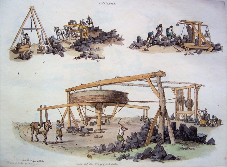 All kinds of rural economic activities are represented, but the technology that Pyne records is strictly pre-industrial and probably based on sketches made in the south of England: even the colliery that he depicts is working by horse-power, although steam-engines had already been in use in the Northern coal-fields for decades. Here in Plate 2 the two top images show figures working at the weighing of coals, while at the bottom is a machine for raising the coals from the pit.