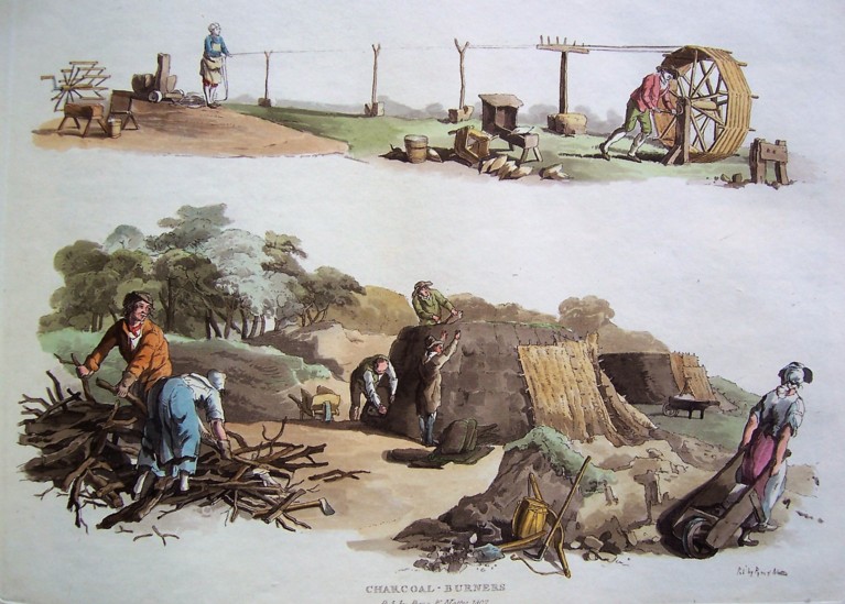 Another plate shows, top and bottom, the unrelated activities of rope-making and the woodland industry of charcoal burning, a skilled three-day process of charring in turf-sided ovens the wood seen being collected on the left.