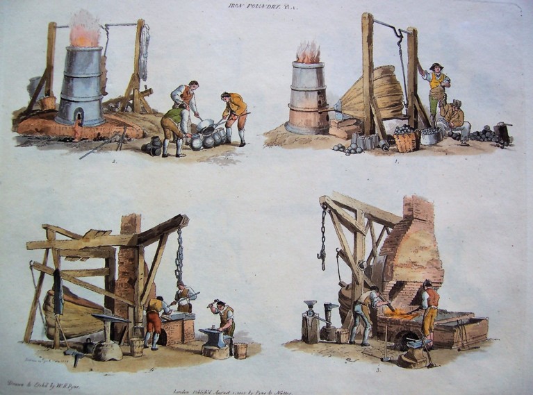 Much more industrial are the various processes in the iron foundry. The top two images show figures busy with the casting of cannon balls (Britain is engaged in long years of the Napoleonic Wars). The furnace is serviced by great bellows that are being worked by a (not shown) horse-driven machine connected by an axle. Bottom left is a forge with a bellows blown by means of a lever; bottom right, two men work at a forge, with a crane to move heavy items from fire to anvil.