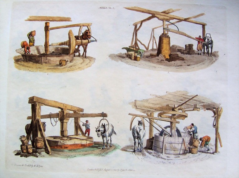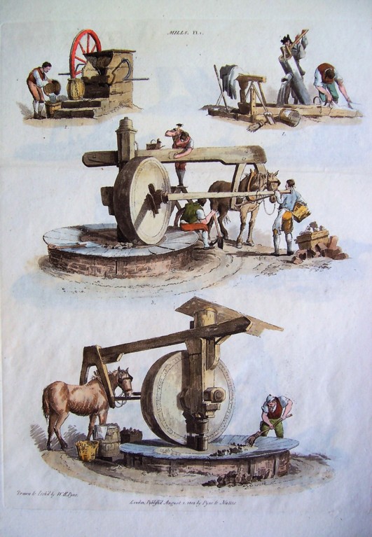 Other mills and their workers depicted by Pyne include mills used by tanners, by potters for grinding clay, for raising water, and for grinding chalk used in lime.