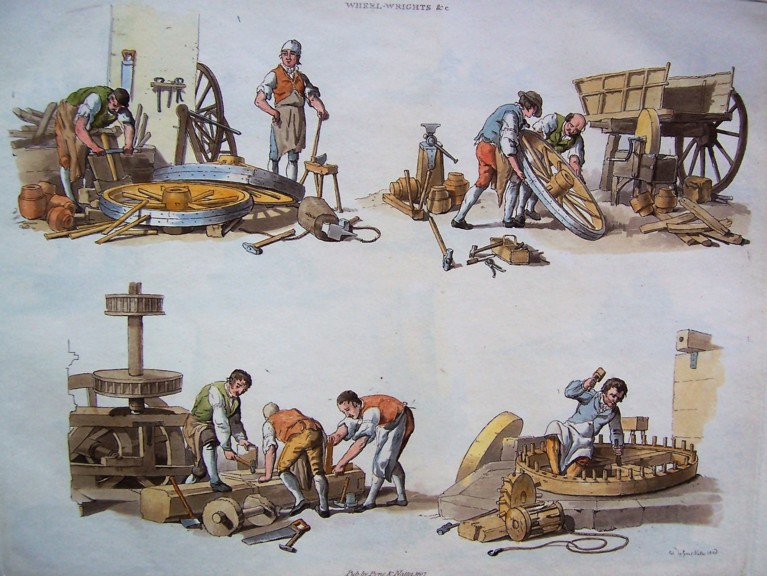Wheelwrights were skilled workers in the different woods used for different parts of wheels, and the figures here are shown making cartwheels, adjusting a cartwheel, and also applying their skills to repair mill-machinery, as they traditionally did.