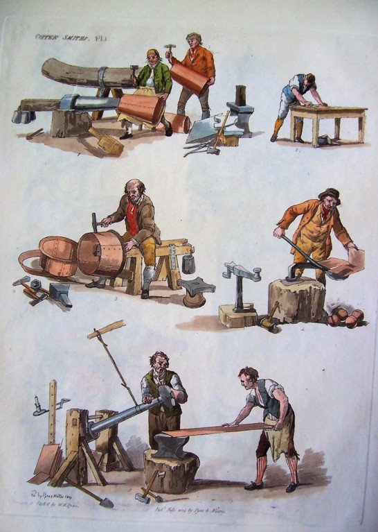 Pyne’s study of copper smiths shows figures making chimney-tops, polishing copper plate, making a copper, cutting up a sheet of copper with shears, and beating copper with a heavy hammer steadied on a strap.